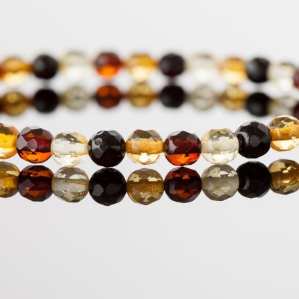 Amber necklace – braided necklace features faceted round ball-shaped beads of polished natural Baltic amber, braided in a semi V-shape design, on a non-elastic cord.