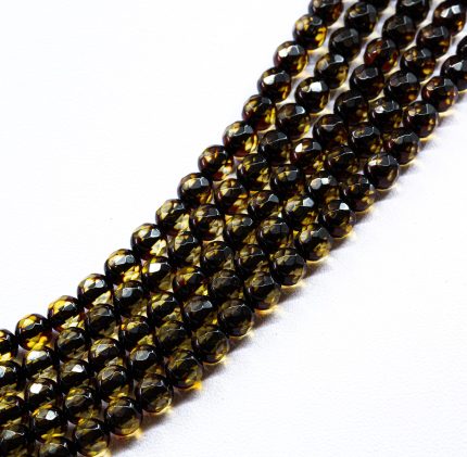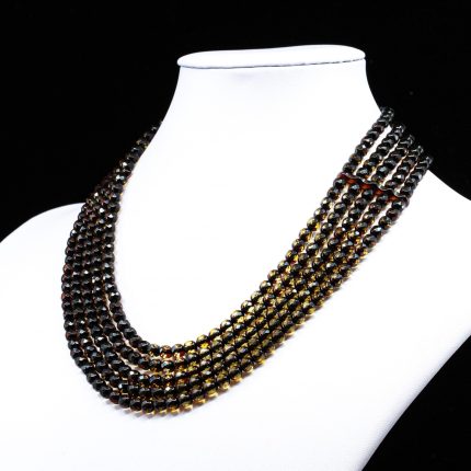 Amber necklace features round ball-shaped beads of polished and matte natural Baltic amber, blackish – greenish color, strung together on a non-elastic cord, with plastic screw clasp.