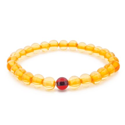 Amber bracelet features round shape beads of natural Baltic amber, strung together on a elastic silicone string.